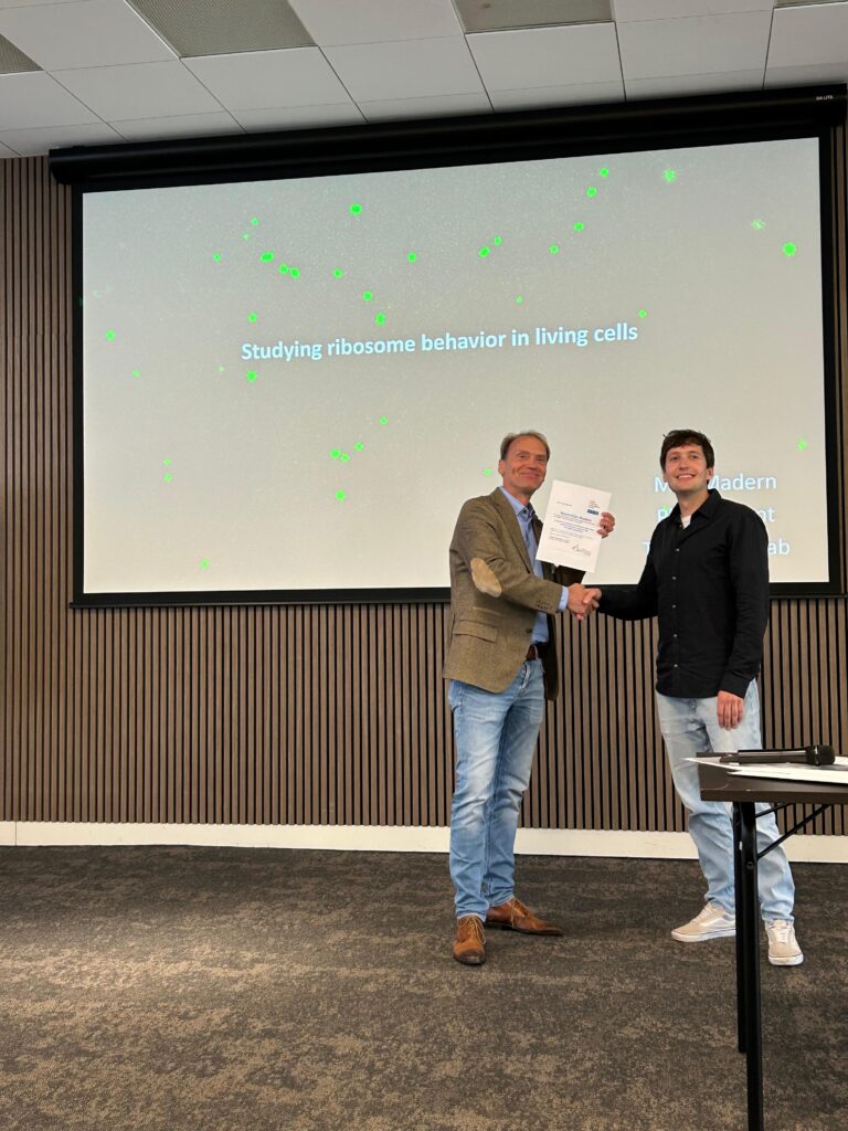 30 september 2025 Max Madern ontvangt CS&D Best Publication Award Terug naar nieuws De CS&D Best Publication Award van dit jaar is toegekend aan Max Madern voor zijn onderzoek naar ribosomen en hun verrassende vermogen om elkaar te helpen onder moeilijke omstandigheden. In zijn artikel, dat wordt toegelicht in dit nieuwsbericht, introduceert hij een nieuwe methode om ribosomen, grote moleculaire machines die eiwitten maken in onze cellen, te bestuderen terwijl ze deze essentiële taak uitvoeren. Door ribosomen te fixeren op circulair RNA konden Max en zijn collega’s ze urenlang in actie volgen. Hun observaties lieten zien dat ribosomen bij moeilijke sequenties niet altijd alleen werken: wanneer een tweede ribosoom een vastgelopen voorgaand ribosoom inhaalt, kan het de eerste helpen de vertaling weer op gang te brengen. Deze ontdekking laat zien dat ribosomen onder stress kunnen samenwerken. De video laat vier verschillende circulaire RNA-translatiesites zien. De stipjes worden gaandeweg feller, wat wijst op actieve translatie door ribosomen terwijl de eiwitketens die ze maken steeds langer worden. Zodra het medicijn puromycine wordt toegevoegd, laten de ribosomen het circulaire RNA los. Zo kunnen de onderzoekers bepalen hoeveel ribosomen er op elk individueel circulair RNA actief waren. In de vier voorbeeldfilmpjes (van links naar rechts) waren dat respectievelijk 1, 2, 3 of 4 ribosomen. Dr. Eric Kalkhoven, coordinator van het CS&D PhD programma, overhandigt het certificaat aan Max Madern Als onderdeel van de prijs presenteerde Max zijn werk tijdens de graduate school masterclass op vrijdag 26 september. Momenteel werkt Max nieuwe resultaten uit waarin hij dezelfde techniek met circulair RNA toepast om de ‘boze tweelingbroer’ van het ribosoom te bestuderen: het proteasoom, een cellulair complex dat eiwitten afbreekt. Omdat ribosomen op circulair RNA ongewoon grote eiwitten produceren, ontstaat er een handig ‘bijproduct’ waarmee zichtbaar wordt hoe proteasomen deze eiwitten stukje bij beetje afbreken. Inzicht krijgen in hoe deze essentiële eiwitcomplexen functioneren, betekent een belangrijke stap richting een beter begrip van deze fundamentele levensprocessen.