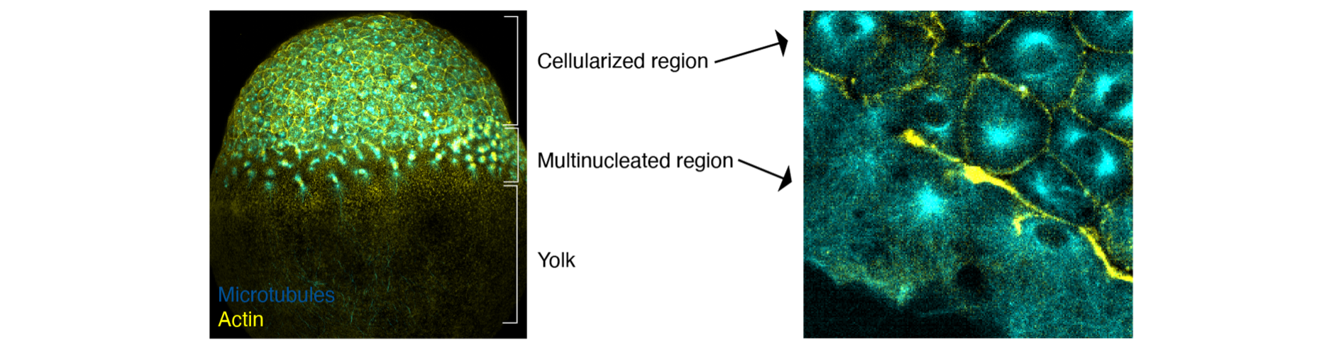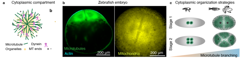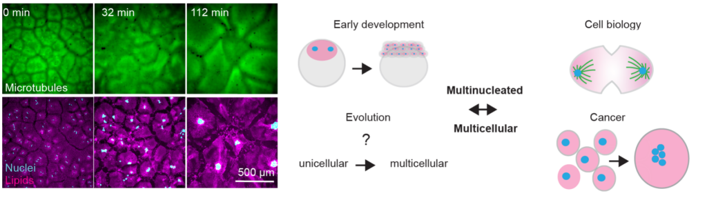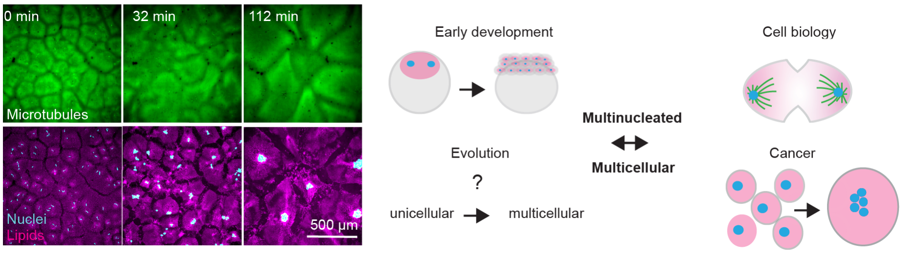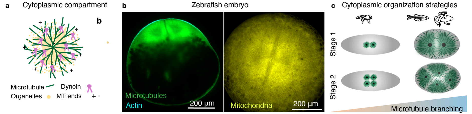 Rinaldin: Cellular organization in development Back to research group The Rinaldin group uses quantitative biology approaches to understand how cellular structures form and adapt during the development of multicellular organisms. Across all scales, multicellular systems are highly organized. Molecules, biochemical activities, and cells interact to generate emergent structures that collectively enable life to function. These organizational processes are clearly observed in embryonic development, where from a single egg, molecules self-organize into cells that become tissues, and ultimately organs. How does the organization of the cellular machinery emerge and adapt to achieve robust yet flexible development? To address this question, our group uses an interdisciplinary approach that integrates physical and biochemical techniques. We use eggs and embryos of X. laevis frogs and zebrafish as model systems. We build on comparative biology with further organisms to understand how developmental programs evolve and how the underlying cellular machinery adapts to maintain cellular homeostasis across species. Compartmentalization in multinucleated systems Many embryos start their development consisting of a shared cytoplasm where multiple nuclei coexist, a multinucleated state. This state lacks cellular membranes, requiring therefore different mechanisms to separate the cell content. We have for example recently discovered that properties of growth of microtubule asters define the boundaries, stability, and organization strategies of compartments in the cytoplasm. From left to right: (a) Schematic diagram of a cytoplasmic compartments. (b) Fluorescence image of microtubule asters, actin, and mitochondria in early zebrafish embryos. (c) Cytoplasmic organization strategies of early embryos depending on the amount of microtubule branching. Adapted from Rinaldin et al., XXX. Development and maintenance of multicellularity Across biology, there is an evolutionary drive towards multicellularity, yet at the same time multicellularity is often “lost” in diseases (cancer, liver diseases, etc…) and tissue formation, and multicellular tissues become multinucleated. We are interested in uncovering the mechanistic principles that govern these transitions and ultimately learn how to control them to prevent disease. We focus our investigation on the microtubule cytoskeleton and cell membrane, structures critical for cytoplasmic and cellular organization. Left: Cytoplasmic compartments in interphase-arrested X. laevis frog egg cytoplasm undergoing microtubule aster invasion and coarsening of cytoplasmic compartments. Adapted from Rinaldin et al., XXX. Right: The transitions between multinucleated and multicellular states across biology. Multinucleated and multicellular states in morpho- and organo-genesis In zebrafish embryonic development, most tissues are organized as multicellular structures, but certain regions form multinucleated states that support key processes such as axis specification and heart formation. How do the distinct organizational properties of multinucleated versus multicellular states affect signaling and morphogenesis? We aim to understand how embryos exploit both architectures to achieve robust and adaptable patterning. Fluorescence microscopy image of an entire zebrafish embryo (left) and zoomed in view of multicellular and multinucleated regions.